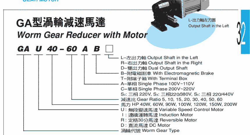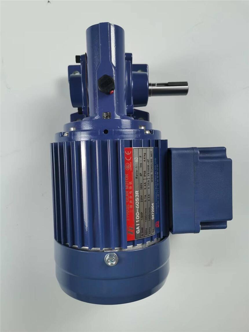 台湾东力电机GAL100-60S3R由电机,减速机,接线盒风扇四部分组成。电机为连续运转,输出功率100W,1;60减速比,三相380V,右出力轴的涡轮减速电机。