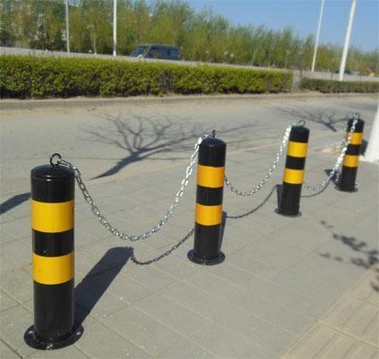 防撞柱又名防护桩,分为固定式与活动式,钢管外贴黄黑反光膜,起到反光提示作用。活动防护桩将立柱提起并移动在任何合适的地点,供车辆通行。在交通完毕之后即可将立柱重新置于底座上,上锁后即可避免其他车辆对于自有车位的侵占。可以在车库前、或者其他认为重要的场合前设置,起到保护好车库大门、避免暴力破坏的作用。防护桩可设置小圆环,用户可根据自己的需要加挂各色链条,能更好的起到防护作用。同时,小圆环的设计也让工作人员的操作移动更为简便容易,可谓是既实用、又人性化。