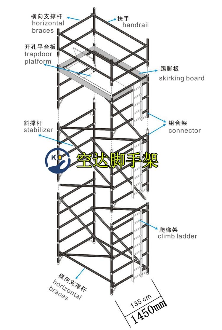 如果是铝合金材质的:一般多功能脚手架都具有移动功能,是钢管材质的:具有异性结构搭建。多功能突出体现是效率与方便,因此设计时,考虑不同场景结构也有所不一样。