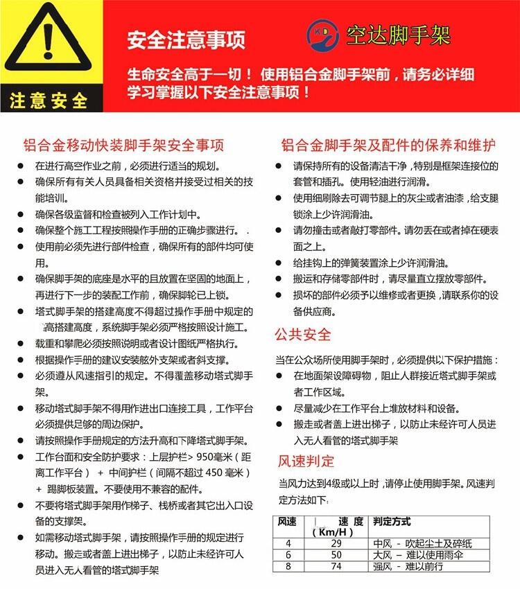 总体来说多功能铝合金脚手架具备防腐功能;使用寿命长;成本低;收益高;荷载大等优势,是工程建筑必备的高空作业设备。除了追求功能多样性,安全性能也不能忽视,不能因为方便而减少配件,安全至上。