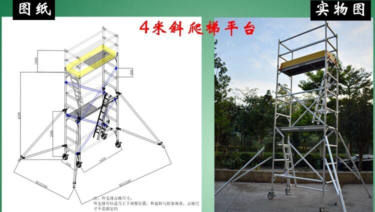 快拆式铝合金脚手架适用于多种地形施工作业,因为其每个脚轮丝杆可以上下自由调节40cm,所以不管是在斜坡还是台阶,楼梯等不平的地面都可以搭建。