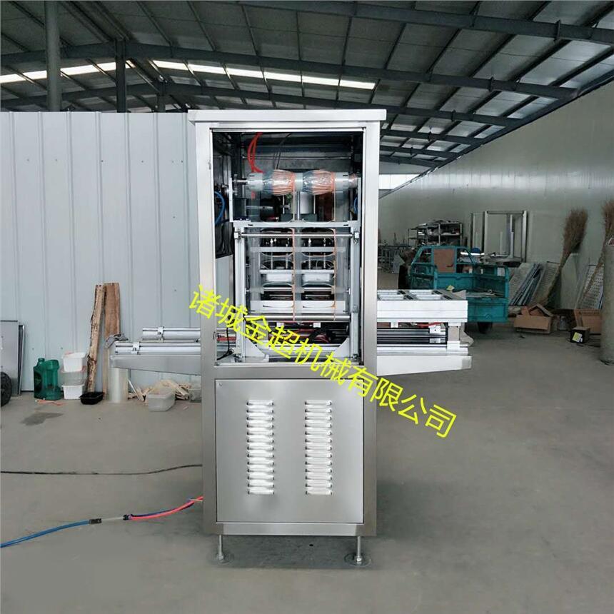 人工将已充填包装盒放入自动输送机构,即可自动连续完成。包装盒自动输入、抽真空、充保鲜气体、热压封口、分切、成品包装盒输出自动完成。