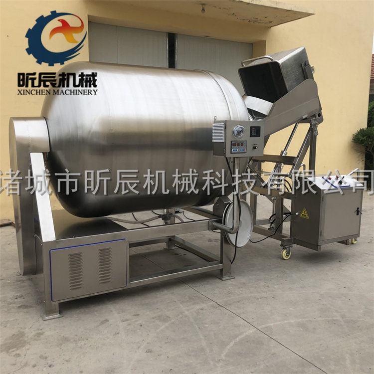 真空滚揉机是在真空状态下,利用物理冲击的原理,让肉在滚筒内上下翻动,相互撞击、摔打,达到滚揉腌渍作用,使肉均匀的吸收腌渍,提高肉的结着力及产品的弹性,通过滚揉、摔打能使肉体蛋白质分解成水溶性蛋白,易被人体吸收,同时能使添加料(淀粉等)与肉体蛋白质互为融合以达到肉质变嫩,口感好,出口率高。本机具有肺呼吸功能,让产品在滚筒内膨胀、缩小了往复运动,改善了肉组织的结构,提高了切面效果。