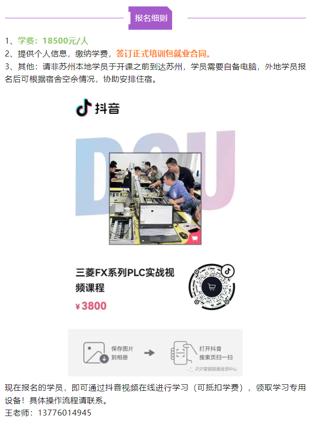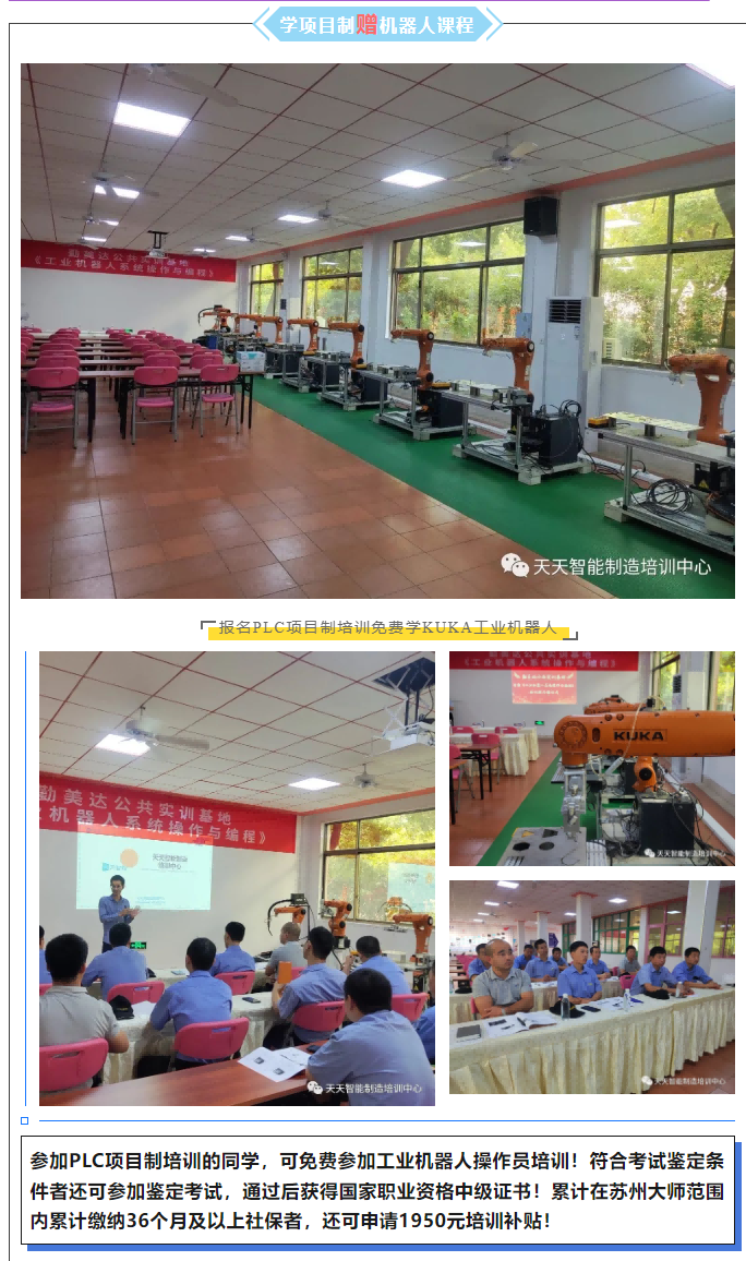 让想进入自动化行业的小白通过4个月的学习,掌握电工基础、PLC基本原理和编程技能,达到培训经历=工作经验的目标,为顺利就业提供夯实的基础。培训合格后包就业,就业单位为苏州及周边区域大中小型自动化公司,就业岗位为PLC调试工程师、机器人调试工程师、视觉调试工程师、设备维修维护工程师等,综合工资5000-10000元/月。