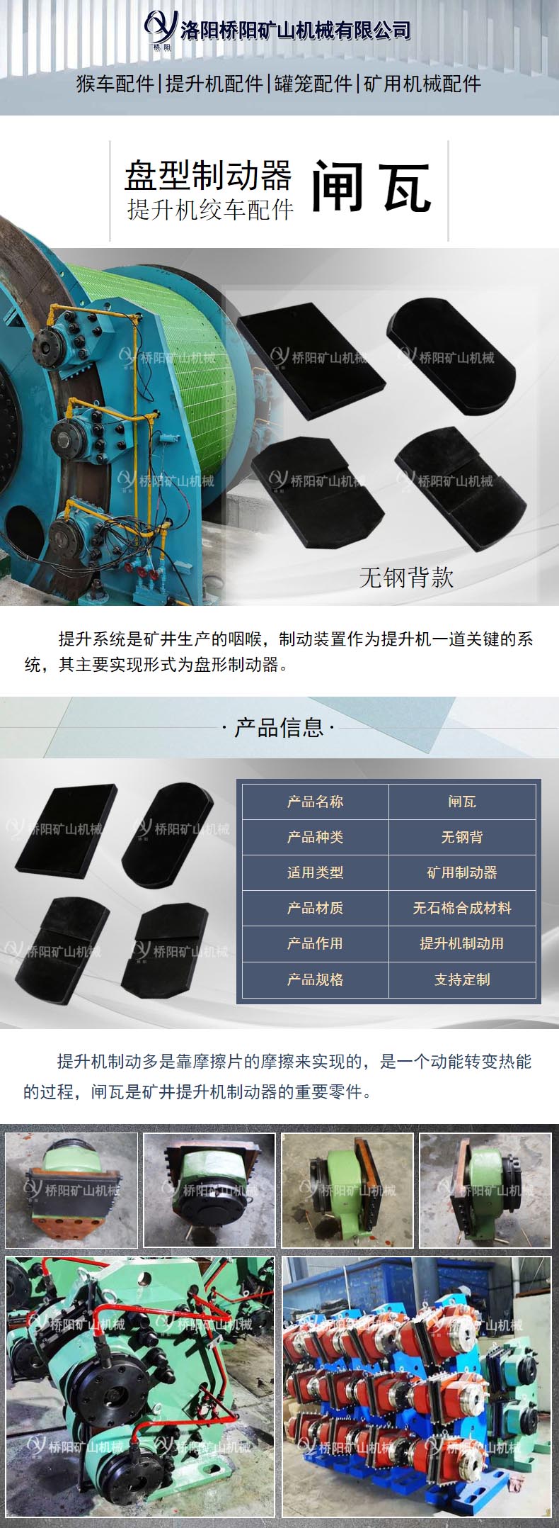 提升系统是矿井生产的咽喉,制动装置作为提升机保障系统,其主要实现形式为盘形制动器。制动多是靠摩擦付的摩擦来实现的,是一个动能转变热能的过程,用作摩擦付的摩阻材料,是制动器运行的保障。闸瓦是矿井提升机制动器的零件之一。在矿井生产过程中,盘形制动器闸瓦频繁地与制动盘进行摩擦来控制提升机的运行。