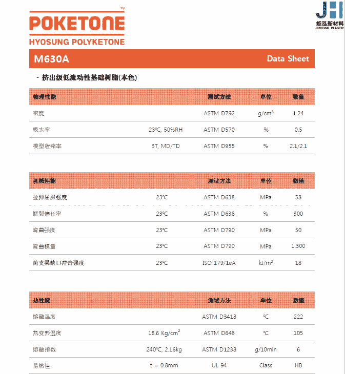 聚酮POKETONE材料:是韩国晓星集团研发生产出的一种综合性能极其优良的工程塑料,属于聚酮类材料。POKETONE是全部主链都由碳素组成的工程塑料,是高结晶性、结实的结晶结构,表现出耐冲击性、耐磨损性、耐化学性、耐燃料性、气体阻隔性能。