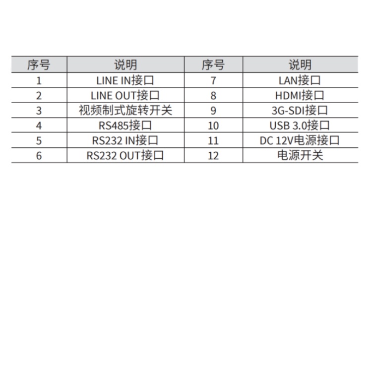 1路, 3G-SDI: BNC类型, 800mVp-p, 75Ω, 遵循SMPTE 424M标准