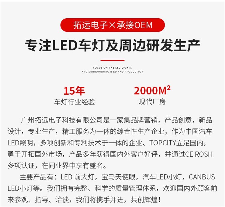 品牌营销,产品创意,新品设计,专业生产,精工服务为一体的综合性生产企业,作为中国汽车LED照明,多项创新和专利技术于一体的企业、TOPCITY立足国内,勇于开拓国外市场,产品多年获得国内外客户好评,在同业界中享有盛名