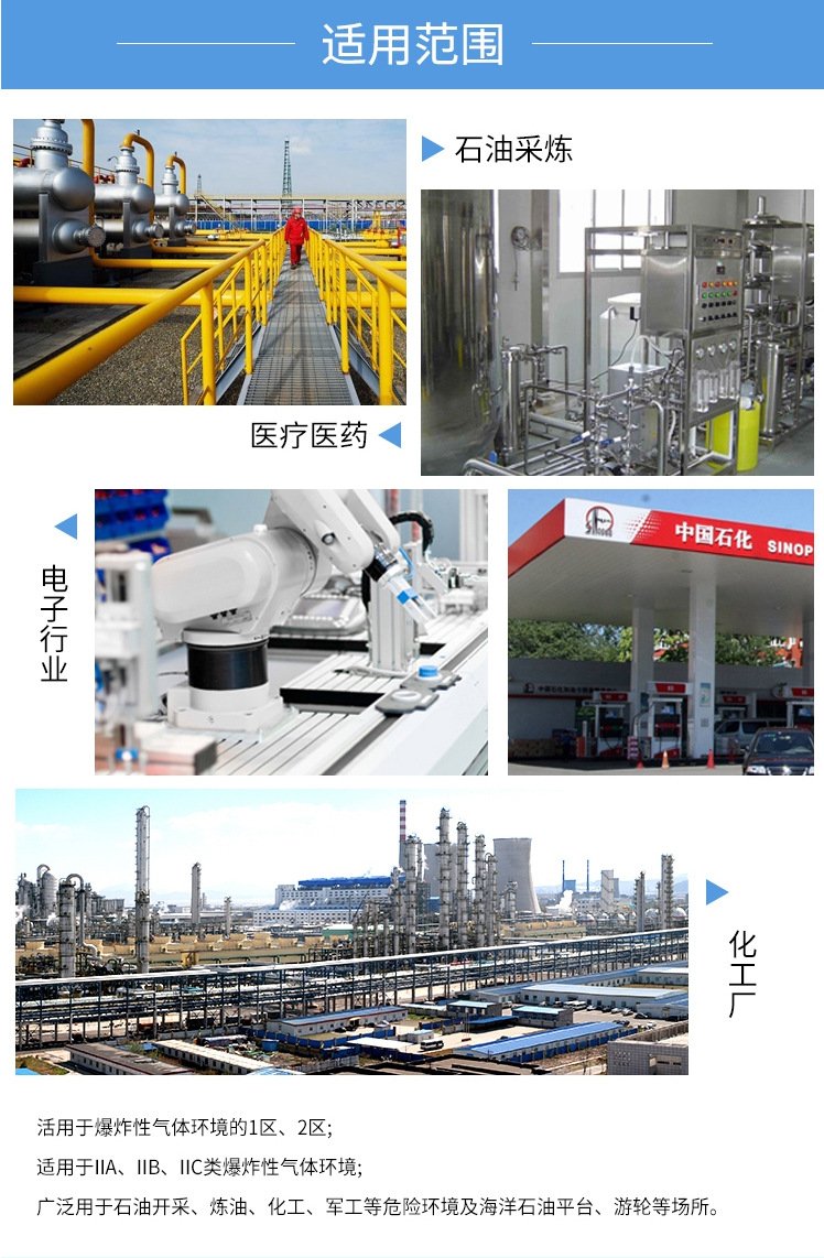 适用范围 | 军工,石油,化工,实验室等防爆场地 | ||