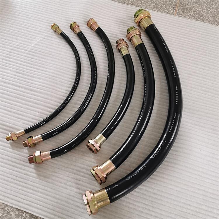 防爆挠性连接管,适用于ⅡBⅡC级T1-T6组爆炸性混合物场所,作为防爆电器设备的进出线连接或钢管布线弯曲难度较大的场所连接之用。防爆挠性管结构软管两端为金属螺纹活接头,管体部分分为金属软管,外层夹布优质橡胶和增强尼布软管护套以及夹层钢丝编织网管三种形式组成。本产品具有耐燃、耐油、耐腐蚀、耐水、耐磨、耐老化、挠性良好、结构牢固、工作可靠等优点。一般有500,700,1000等长度。