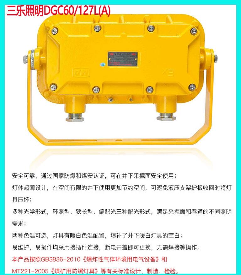 适用于具有甲烷或煤尘爆炸危险的煤矿井下采掘工作面、巷道、硐室作照明使用。