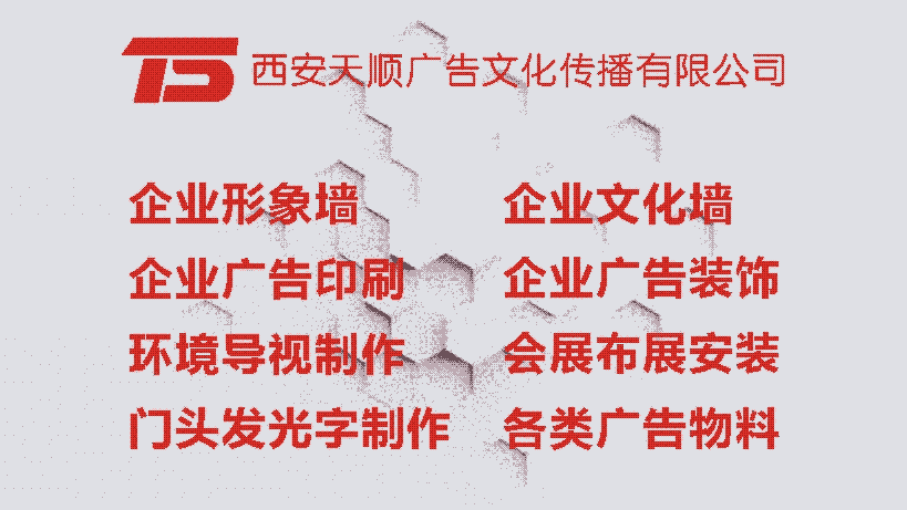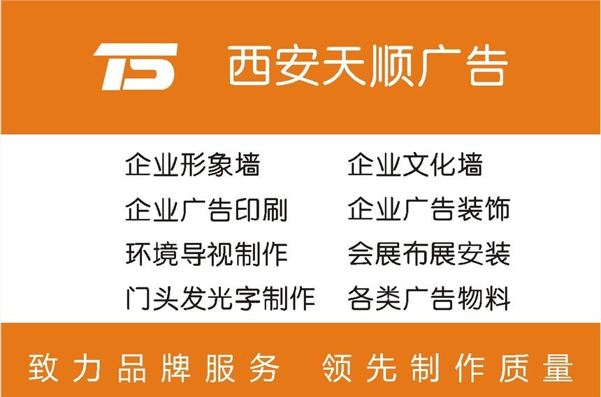 西安天顺广告文化传播有限公司是一家专注于设计,制作,安装为一体的综合性广告公司。在业界有良好的口碑,专业的服务、高性价比的为您解决一切广告制作项目,为您所想,完美呈现,你的托付,值得信赖!
