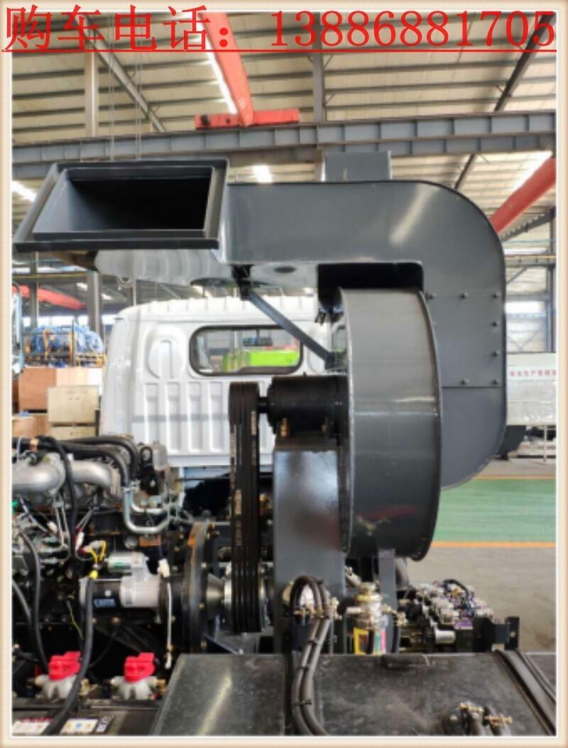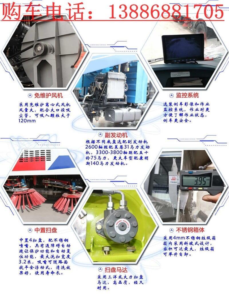 上装标配:带4个扫盘、江铃副发动机、三洋马达、施耐德控制开关、海普瑞斯电磁阀组、无级变速自动离合器、免维护离心式自动风机、不锈钢垃圾箱、尾部LED箭头指示灯、手动泵应急系统、中联北极星电子水泵,垃圾举升自卸功能。