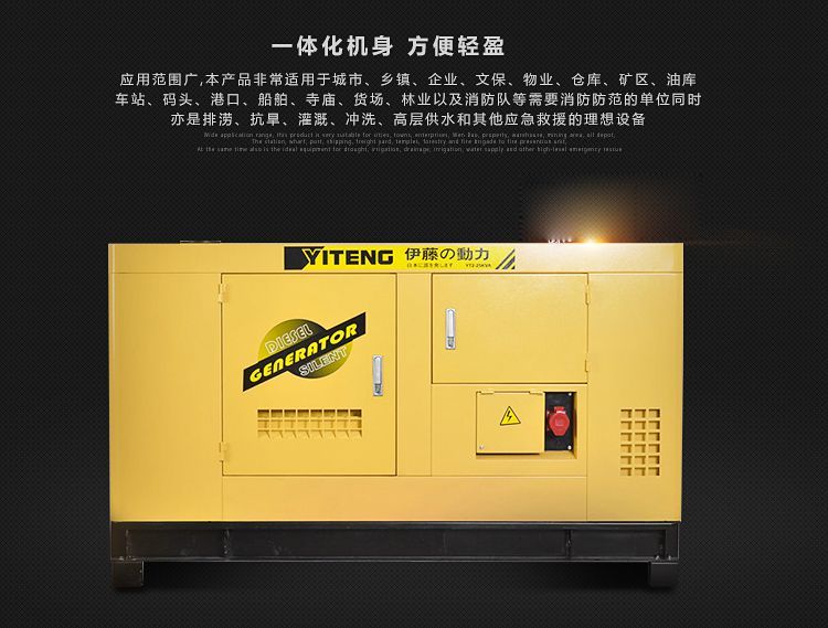 伊藤10KW柴油发电机YT2-12KVA-ATS静音柴油发电机组,柴油发电机组是引进国外低噪音发电机和发动机技术而精心设计的;设计理念 ,品种 产品除具备系列柴油发电机组,柴油发电机组各项功能外,还具备以下特点:机组噪音低,总体机构紧凑,占用空间小;箱体全部为可拆卸式结构,箱体采用钢板拼接而成,表面涂有 防锈漆,同时具备降噪和防雨功能;箱体内部采用多层屏障阻抗错配式消声结构、内置式大型阻抗式消音器。箱体结构设计合理,箱体内部设有大容量油箱,左右同时设有两扇检修门,以便机组故障检修;同时在箱体上开有观察窗和机组紧急停机故障按钮,以便观察机组的运行情况及在机组出现紧急情况时以 快的速度停机避免机组受到损坏。