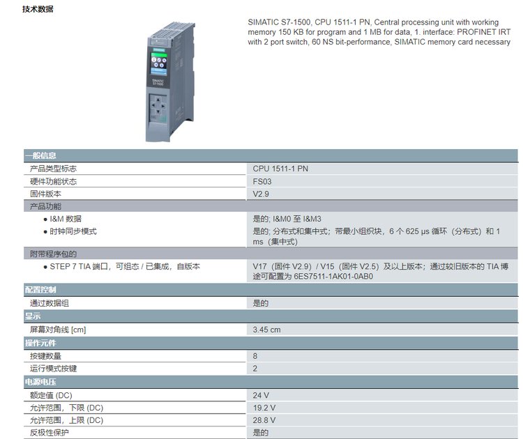 产品类型标志 | CPU 1511-1 PN | ||