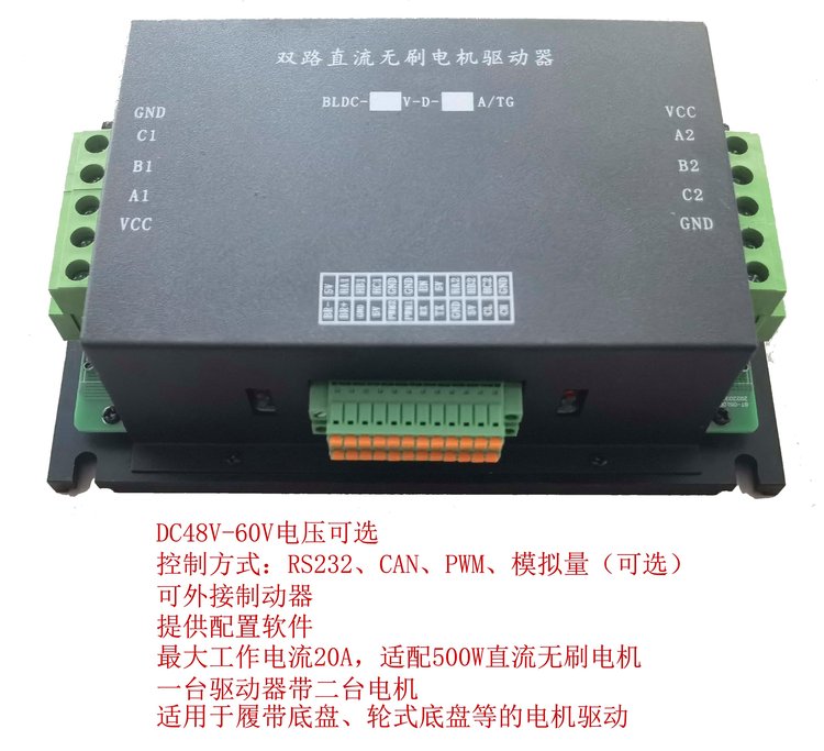 500W双电机直流驱动器是一款大功率智能型双直流无刷马达控制器。该无刷双电机驱动器可同时控制两台直流无刷电机,内部使用32位高性能MCU,采用高级的运动处理算法实现内部电子差速功能。控制器使用电机内部的霍尔信号作为转子位置反馈,配合外部的增量式编码器(1000—2500线)信号控制电机运动,实现速度开环、闭环模式、位置模式、扭矩模式。两路独立的驱动芯片,两路编码器处理芯片,两路霍尔信号处理芯片。同时具有多种故障报警功能。工作模式分为两种;独立模式和混合模式。