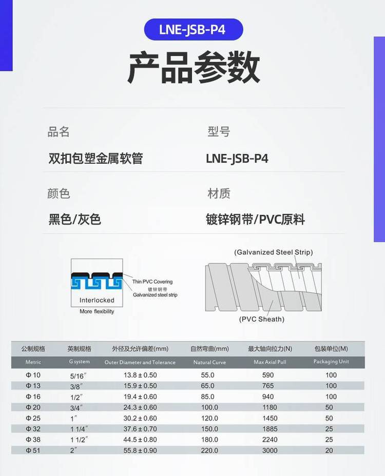 产品特性:双扣镀锌金属软管,重量比其他产品轻,具超柔软与良好的弯曲性能,内部平滑构造在穿引电线时极容易