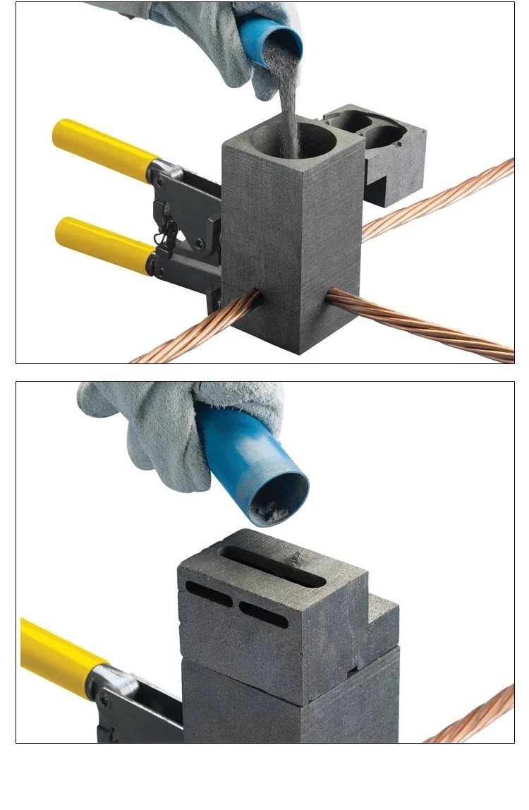 产品使用说明:?步骤一:清洁模具,用加热的方法或一次试验性质的焊焊来去除模具水气,然后把已清洁的金属导体放进熔模内, 夹好模具使其没有缝隙。?步骤二:把金属隔离片放进模具反应腔的底部。