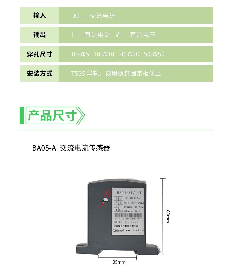 安科瑞BA20-AI/I 交流电流传感器 电机水泵电流采集 输出4-20mA模拟信号PLC 品牌 | 安科瑞电气 | ||