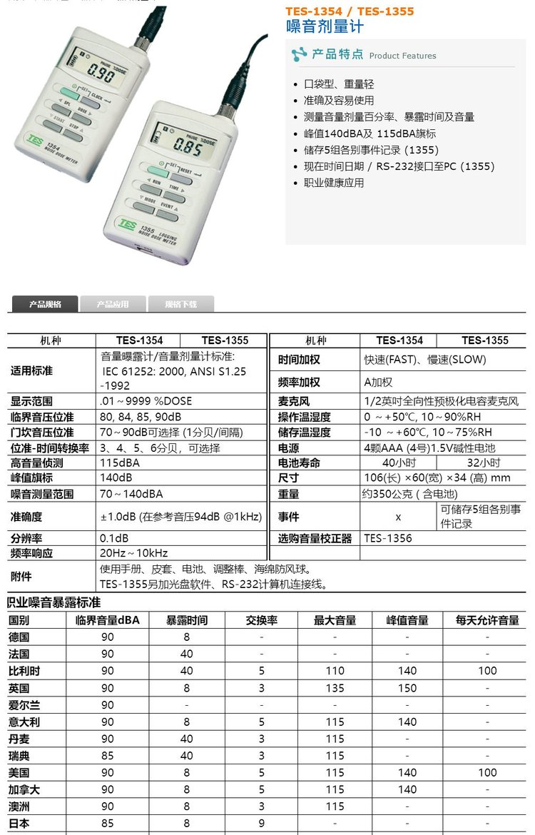 泰仕TES-1354/1355数字噪音剂量计手持式噪音测试仪噪音音量仪 品牌 | 泰仕TES | ||