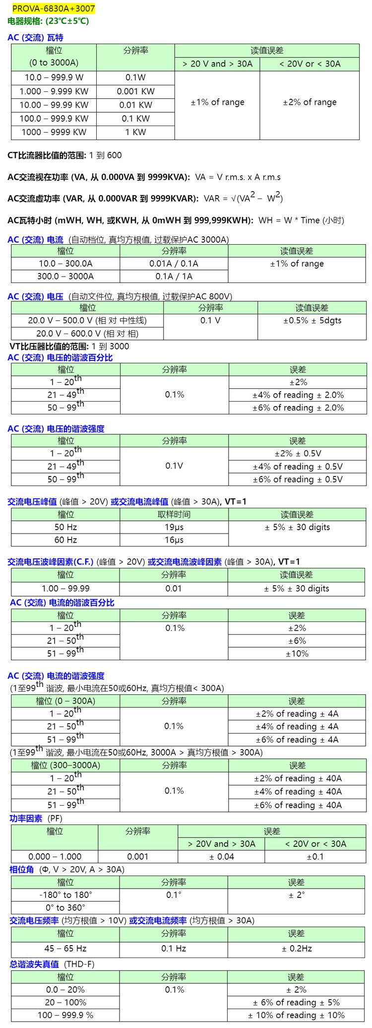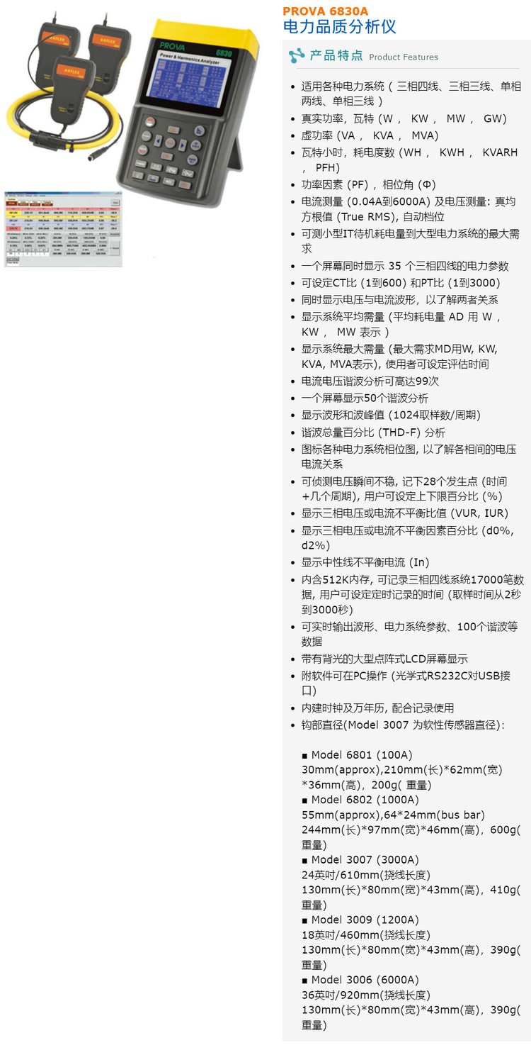 PROVA-6830A 3009/3007/3006三相电能质量分析仪电力谐波检测仪 品牌 | 泰仕TES | ||