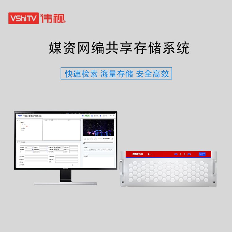 伟视科技VSMAM媒资存储管理一体机,集成了国际先进的媒资存储管理技术,实现用户数据资料的采集、编辑、编目标引、存储管理下载输出等业务处理要求的情况下,采用成熟、标准的素材管理技术,采用模块化设计方法,适应未来发展需要,极大的满足了媒体工作者对媒体数据的大容量存储和管理需求。