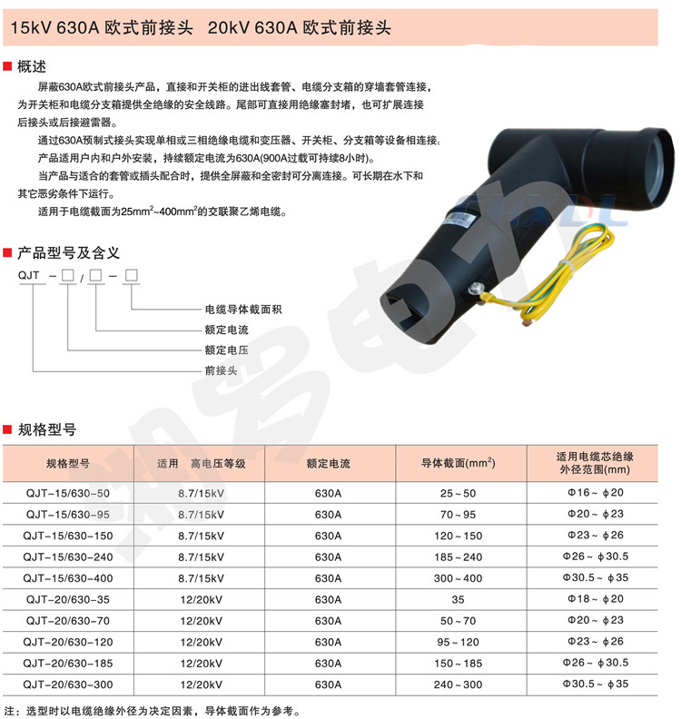 屏蔽630A欧式前接头产品,直接和开关柜的进出线套管、电缆分支箱的穿墙套管连接,为开关柜和电缆分支箱提供全绝缘的安全线路。尾部可直接用绝缘塞封堵,也可扩展连接后接头或后接避雷器。