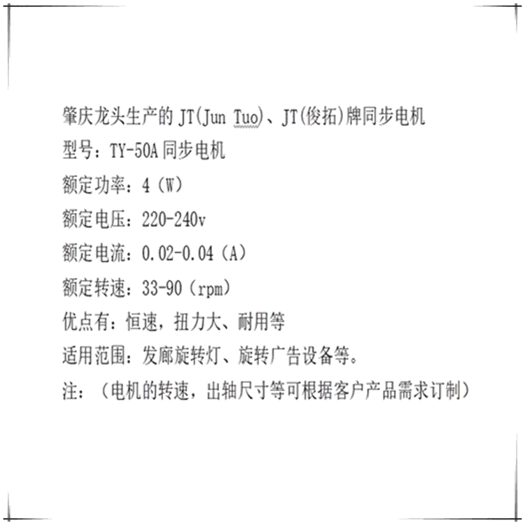 肇庆龙头生产的JT(Jun Tuo)、JT(俊拓)牌电机产品广泛应用于风扇、冷气扇、电暖器、暖风机、制冰机、烤箱、空气炸锅、微波炉、壁炉、过塑机、塑封机、灯饰等各种类家用电器中,并且先后获得了ISO9001质量管理体系、CCC、UL、VDE、CE、CB等国际认证。 产品型号主要有TY-50系列、TYK系列、TY-40系列,绝缘等级有A级、B级、F级、H级、N级。具有恒速转动、低噪音、扭矩大、耐高温、经久耐用以及环保节能等特点,电压范围有220~240V 、100~120V、24V、12V、 6V等,转速范围0.4r/min~90r/min 。 可根据客户产品的实际情况订做,产品销售涉及国内、外,是国内同步电机的主要企业之一。 本公司以"不敢言大、只求专精"经营理念赢得了广大消费者的好评,29年专注同步电机的制造,使公司保持了逐年递增的发展业绩,并连续荣获包括"优质供应商"、"国家高新企业" 等在内的多项殊荣。