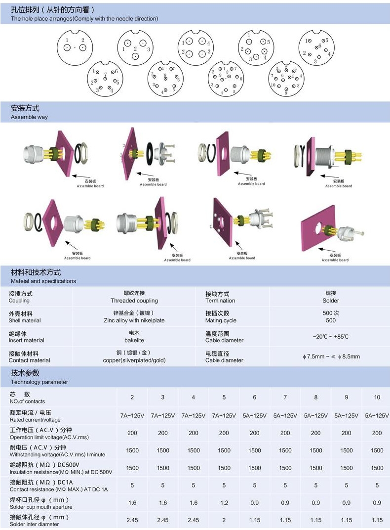 16M系列连接器,有面板固定式、电缆对接式两种安装方式。配合面板开孔16MM。本产品可选芯数(2,3,4,5,6,7,8,9,10)主要用于音频设备、仪器仪表、数控设备中的信号传输作用,插头插座采用螺纹式连接。该款连接器,具有防误插设计,绝缘性能好,工作性能稳定,结构简单用户接线方便,和安装便捷的优点,性价比高。