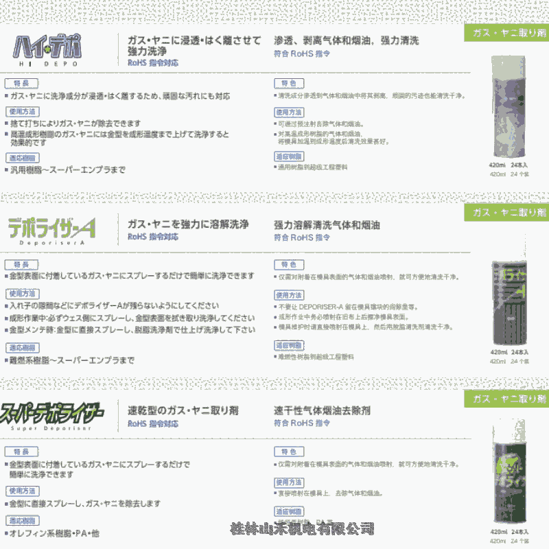 桂林山禾机电有限公司具有危险化学品经营许可证,有自己的化学品进口仓库, 是日本山一化学YAMACHI华南总代理,优势供应日本山一化学(YAMAICHI)工業株式会社生产的全系列产品:脱模剂、防锖剂、防锈剂、清洗剂、润滑剂、高温润滑脂,常用产品型号如下: 山一化学(YAMAICHI)防锈剂、气化性防锖剂 PART II ; 山一化学(YAMAICHI)脱脂洗净剂 E.O. CLEANER; 山一化学(YAMAICHI)金型脱脂清洗剂DX. CLEANER; 山一化学(YAMAICHI)离型剂 SEPALUCK NO.100S ; 山一化学(YAMAICHI)润滑剂RUST-CUT SP; 山一化学(YAMAICHI)除油脂剂 DEPO-RISER A ; 山一化学(YAMAICHI)除油脂剂SUPER DEPORISER; 山一化学(YAMAICHI)高温润滑脂GREASE NS1001; 山一化学(YAMAICHI)金型防锖剂 SUPER GUARDMAN 。