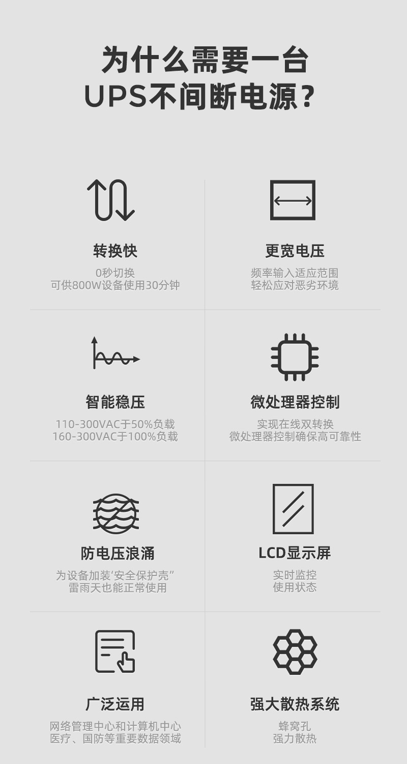 输入电压范围:UPS允许市电变化的范围,范围越大说明UPS适应性越好