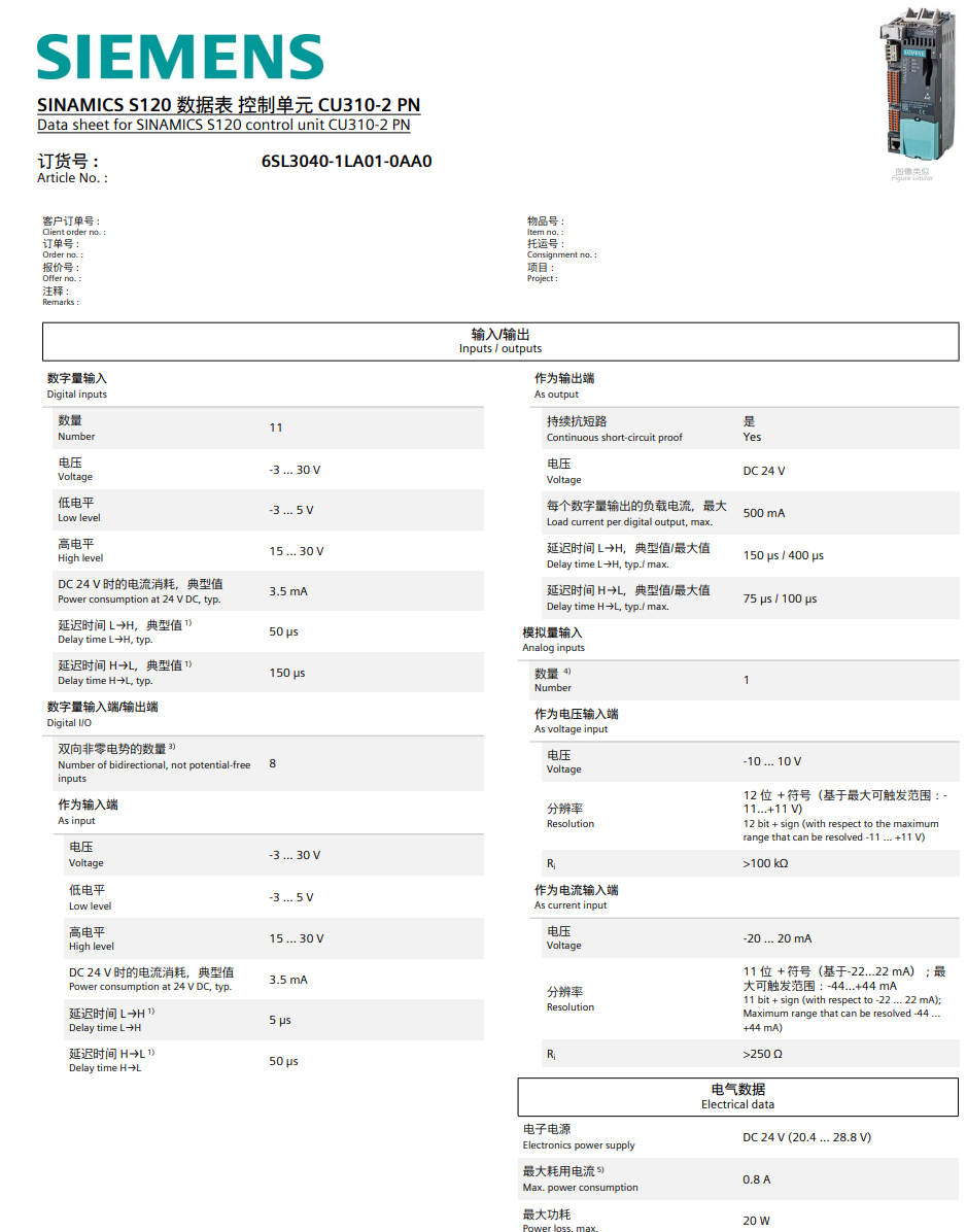 SINAMICS S120 控制单元 CU310-2 PN 带 PROFINET 接口 不带 CF 卡