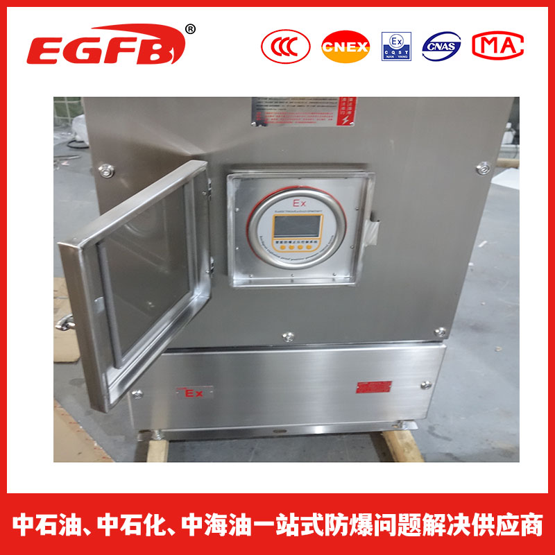 采用介质隔离点燃源的防爆措施。即:把用户所用的电器元件安装在一个充满正压洁净气体的柜体内,使外部环境中易燃易爆的混合性气体无法接触到电器元件在正常工作时所产生的电火花或危险温度,从而达到电器防爆的目的。