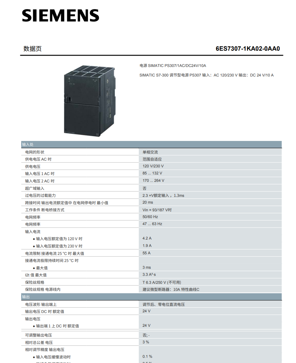 SIMATIC S7-300 调节型电源 PS307 输入:AC 120/230 V 输出:DC 24 V/10 A