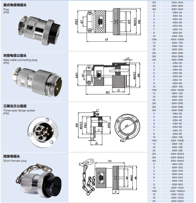 M型系列电连接器: 该系列电连接器壳体号从12到48,有直式、弯式、对接式三种,接触体孔径有1.2mm、1.5mm、2mm、2.5mm、3mm、3.5mm、4mm、4.5mm、5mm、6mm。电流从1A到40A。 P型系列电连接器: 该系列电连接器是新一代的直式连接器,壳体号从12到40,有直式、弯式、和金属软管式三种,接触体孔径有0.9mm、1mm、1.5mm、1.6mm、2.4mm、2.8mm、3.5mm。电流从3A到40A均有。 防水系列电连接器: 该系列电连接器是防水型电连接器,防水性能均达到IP67,有卡扣式、螺纹式两种连接方式。操作简单,体积小,重量轻,规格齐全,可盲目插合。接触体采用优质铜使接触性能更佳,还可以根据客户需求增加别的芯数。 5015系列电连接器: 该系列电连接器是我司仿美国MS-C-5015标准研制生产的新型电连接器,壳体号从10到32。该产品接触件采用冠簧结构,具有优良的接触性能。其中直式连接器具有IP67的防水性能。该系列电连接器适用于要求电流、电压都比较大的设备或仪器。 产品采用国际国内标准生产,可与美欧、日韩和台湾等名牌连接器进行互换,规格多样,品种齐全,连接可靠,价格实惠,实用、美观,广泛用于机床电器、数控设备、医疗器械、伺服电机、船舶和航空等行业。内部芯件采用绝缘可靠、耐高温的PPS工程复合材料,插针插孔采用优质铜材镀金处理,外壳采用合金电镀处理,防腐性能良好。结构形式有固定面板安装式和对接式两种,并有带固定保护盖和不固定保护盖之分,可根据需要任意选用。