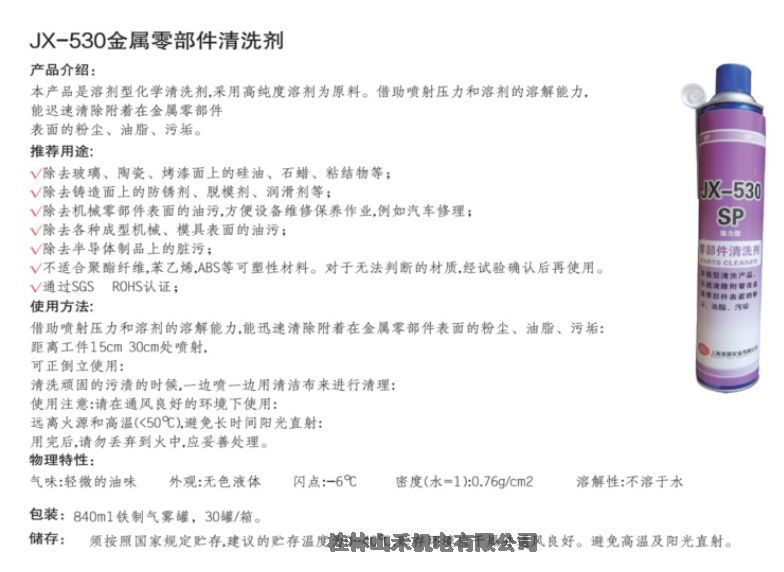 本产品是溶剂型化学清洗剂,采用高纯度溶剂为原料。借助喷射压力和溶剂的溶解能力,能迟速清除附着在金属零部件表面的粉尘、油脂、污垢。