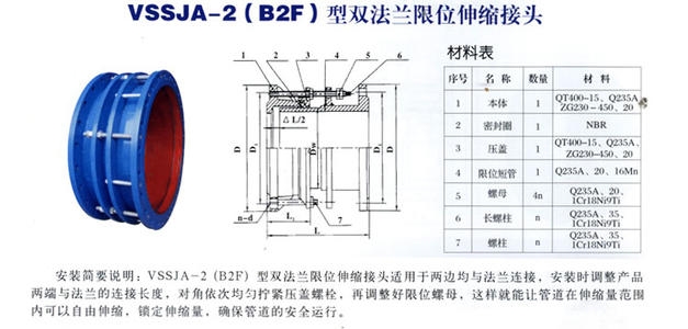 B2F(VSSJA-2)双法兰限位伸缩接头是由本体、密封圈、压盖、伸缩短管等主要部件组成。在松套伸缩接头原有性能的基础上增设限位装置,在最大伸缩量处用双螺母锁定。B2F(VSSJA-2)双法兰限位伸缩接头适用于两边均与法兰连接,安装时调整产品两端连接长度,对角依次均匀拧紧压盖螺栓,再调整好限位螺母,这样就能让管道自由伸缩,锁定伸缩量,确保管道的安全运行。