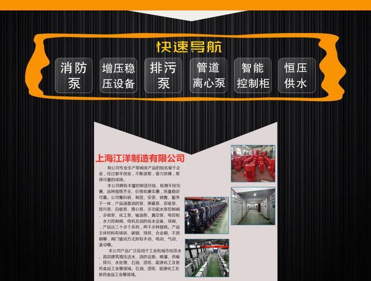 上海江洋是一家供货生产一体的制造有限公司 公司主要生产 消防水泵 生活供水设备 增压稳压设备 管道泵等 资质 通过消防认证? 公司拥有设计性强 队伍 和 的生产设备.丰富经验的生产员工 生产体系 服务周到 的管理 达到行业 水平 产品 .生产产品有 工业泵 自吸泵 消防泵 柴油泵 离心泵 真空泵 排污泵 真空泵 给水系统? 控制柜生产?