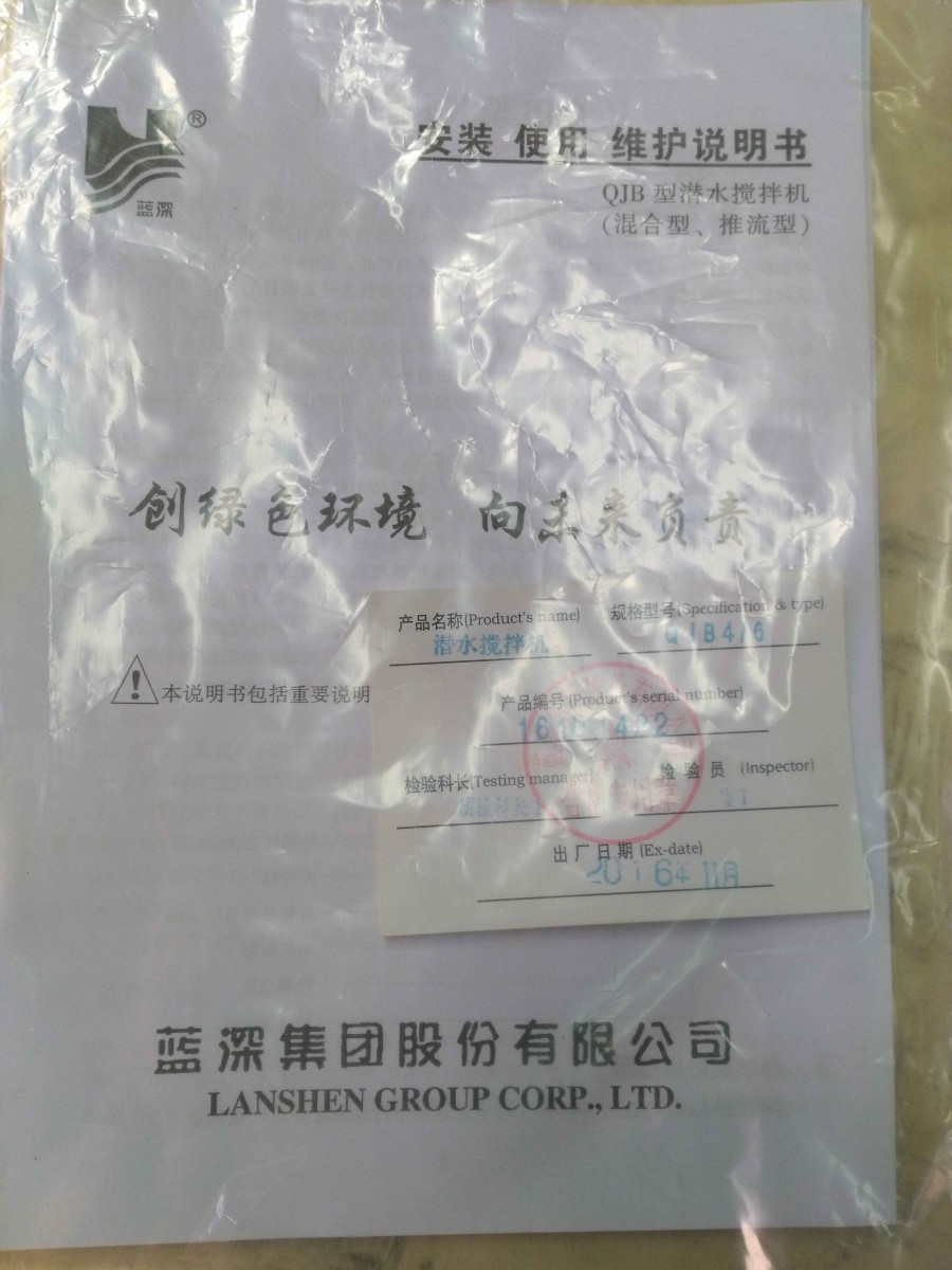 南京蓝深潜水搅拌机装置由潜水电机、叶轮、轴、螺旋桨、支架、导杆、提升装置和电缆等部分组成。成套地配备安全、有效及可靠运行所需的附件、紧固件、备品备件、保护器、就地控制箱和接线箱以及所需电缆,一套提升装置(可移动提升支架、提升葫芦、不锈钢提升链和吊钩等)。每套主要包括以下部件:(1)装配完整的潜水搅拌机
