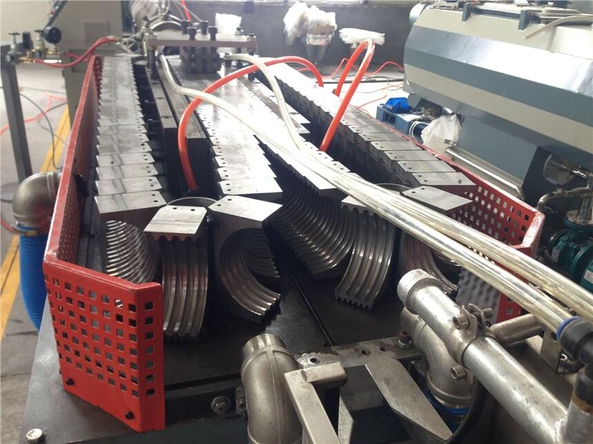 真空成型波纹时,模块上开有许多抽空小孔,并且没有冷却通道,当祝头挤出的外层管坯和模块接触时,外层管坯由于真空作用而吸附在模块的型腔上,形成波纹。而挤出的内层管坯则吸附在机头前端的定径套上。