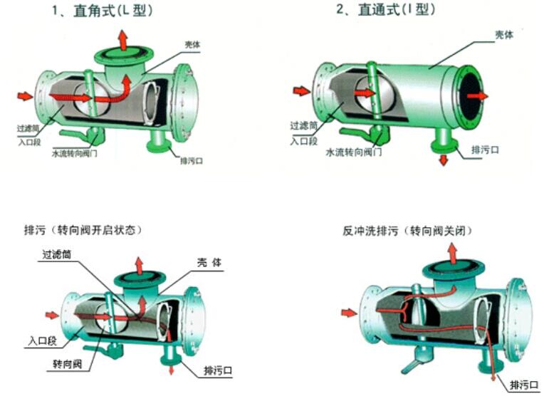 反冲洗时,水流转向阀为关闭状态,排污阀开启,这时水流被迫从过滤网筒的入口段网孔进入过滤筒外侧与壳体夹层,反向从网筒外侧冲洗粘附在网孔上的杂质,达到清洁过滤网的目的。由于转向阀关闭,水经过反冲阀后流速增大,反洗好。
