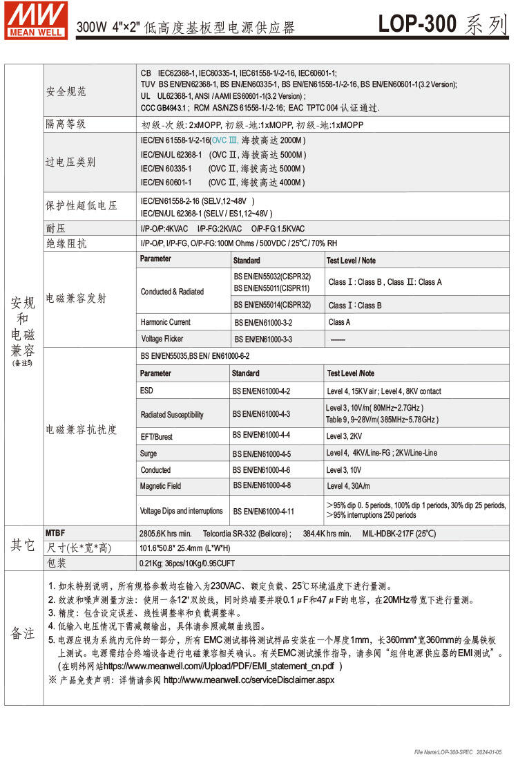明纬(MEANWELL)LOP-300-24 多领域用基板型超薄开关电源