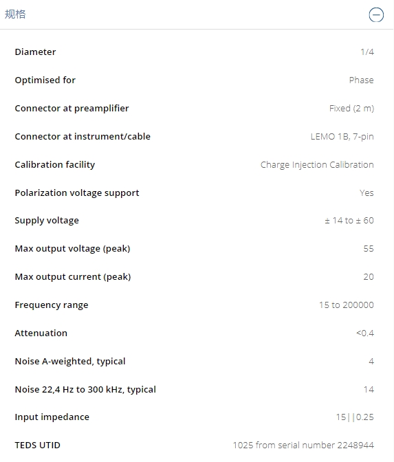 高失真限值和极低的本底噪声级提供了广泛的动态范围。可以直接连接?英寸传声器,连接1/8英寸型传声器需要使用适配器。前置放大器、电缆及其连接器全部符合EMC要求。可以使用其获的电荷注入校准(CIC)技术现场验证传声器、前置放大器和电缆的状态。低输出阻抗和高输出电流能力意味着在前置放大器和测量仪器之间使用长电缆也不会损失信号质量。