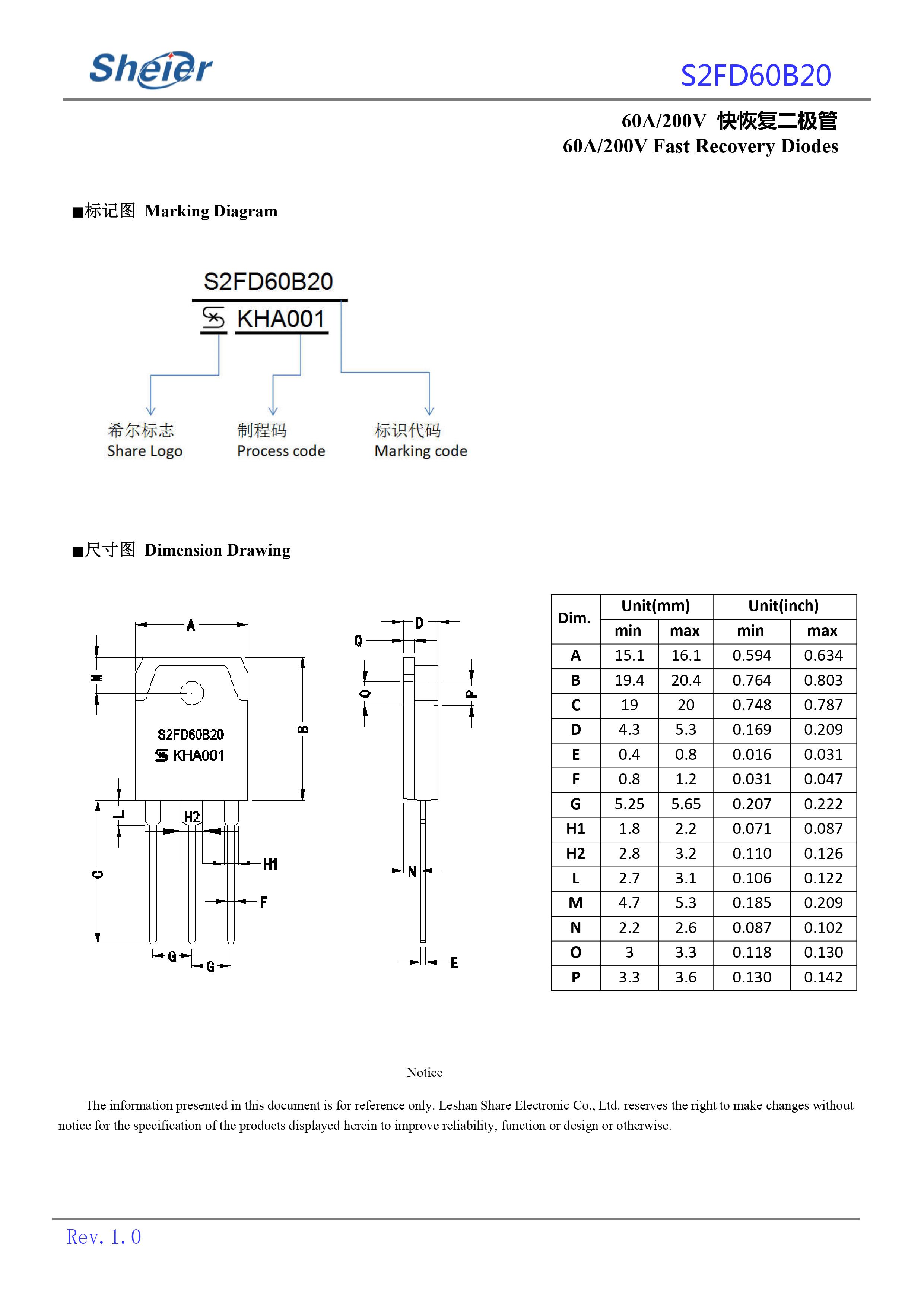 sheier/乐山希尔 全新原厂原装快恢复二极管:S2FD60B20;正向整流电流:60A;反向峰值电压:200V;反向恢复时间:30ns;正向压降Trr:1.0V;封装方式:TO-3P。通用于电源、电器、适配器、充电器、充电桩、工控、医疗设备、工业特种电源、高频电源、风光储新能源、逆变器、伺服电机马达等产品电路作整流、续流、开关、钳位、防反接、防逆回流等作用。GPP大芯片高电压大电流超快恢复时间整流二极管S2FD60B20。【页面标价非成交价,请联系详询报价】