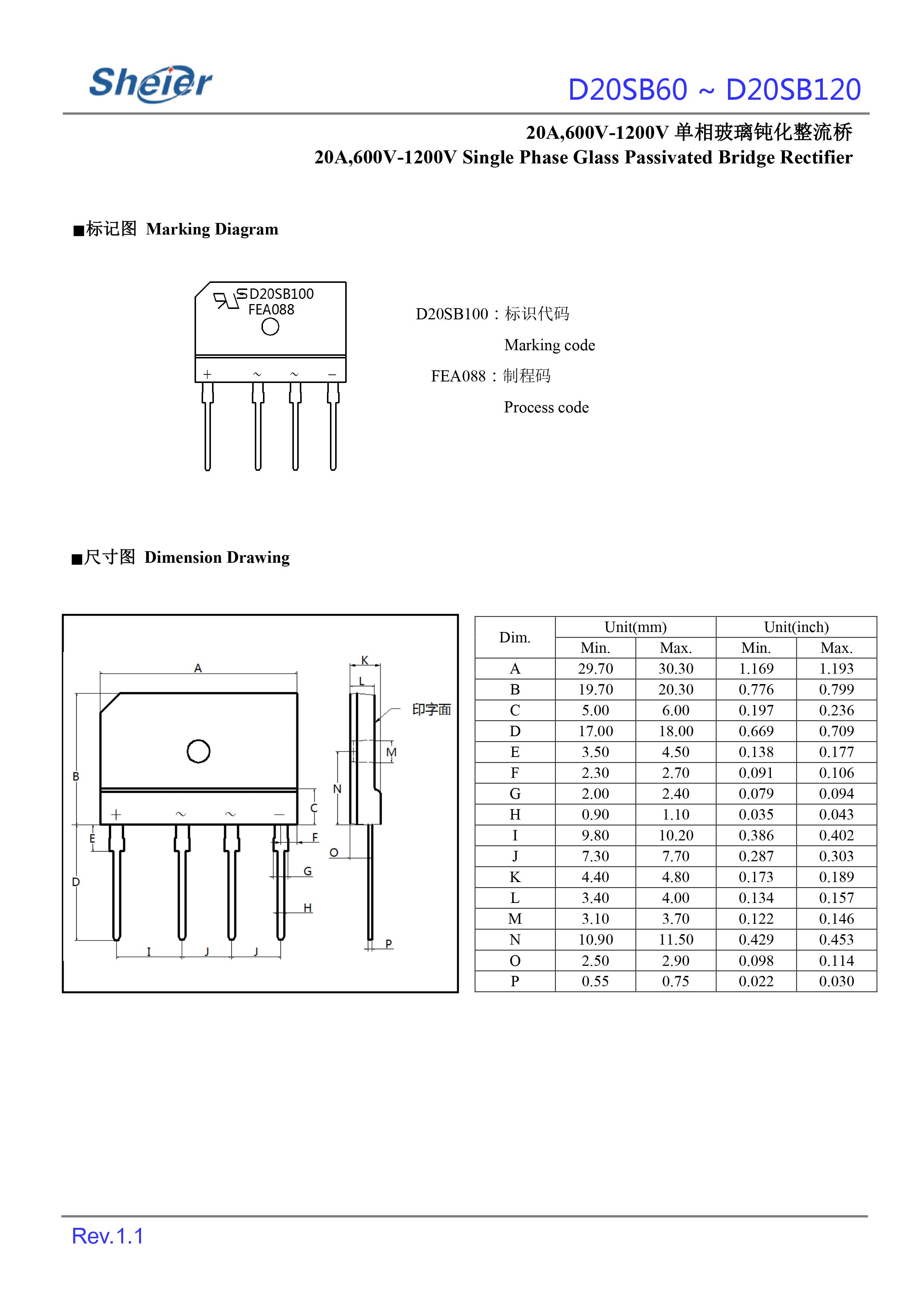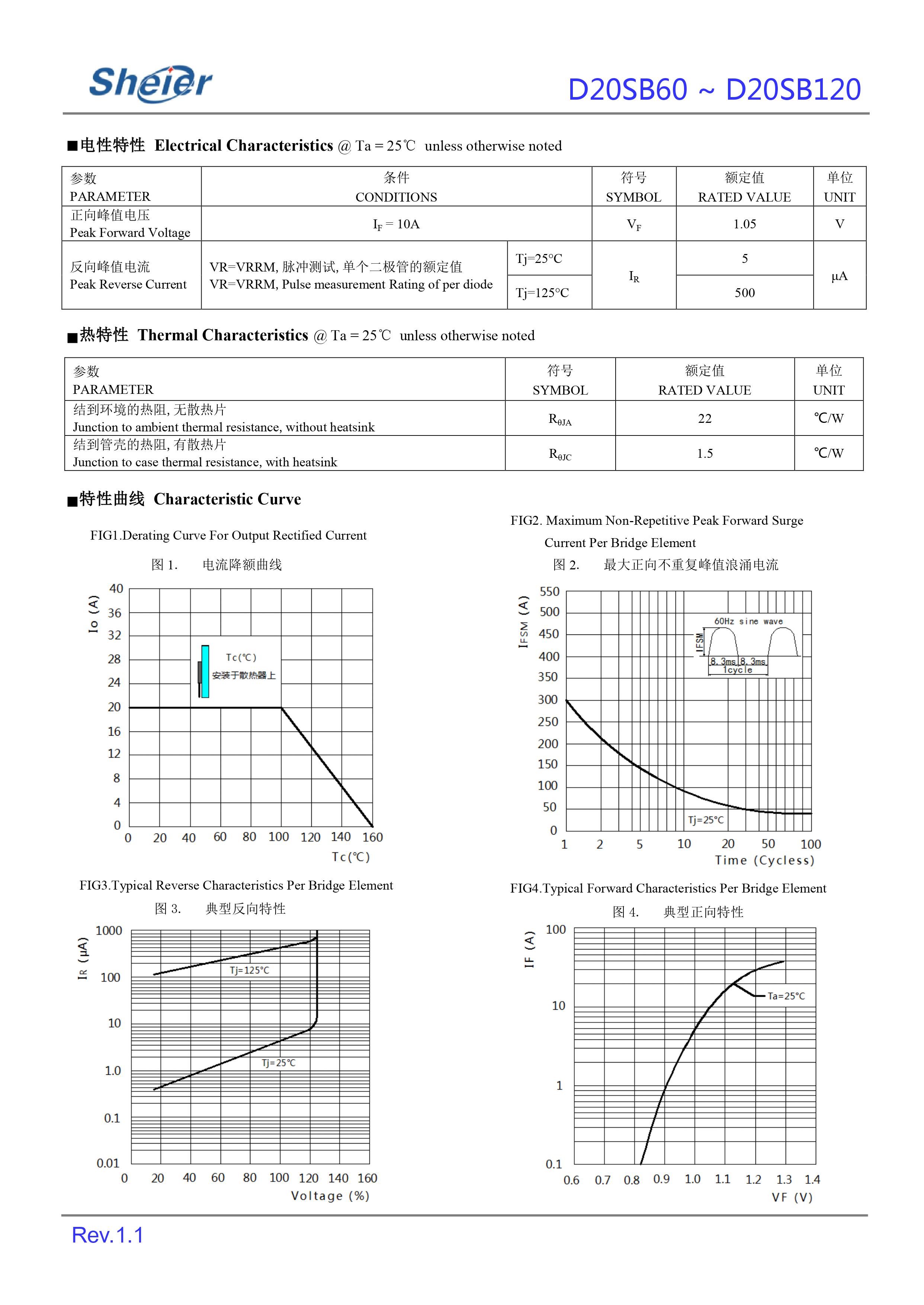 Sheier/希尔 原厂原装全新正品整流桥:D25SB120/D25SB100/D25SB80/D25SB60;最大正向平均整流电流IF:25A;最大正向峰值抗浪涌电流IFSM:350A;最大反向峰值电压VRRM:1200V~600V;正向压降VF:1.05V;反向漏电流IR:5ua;芯片工作储存结温:-55℃~150℃;安装封装方式:D-SB大体: 30.3*4.8*20.3mm。
