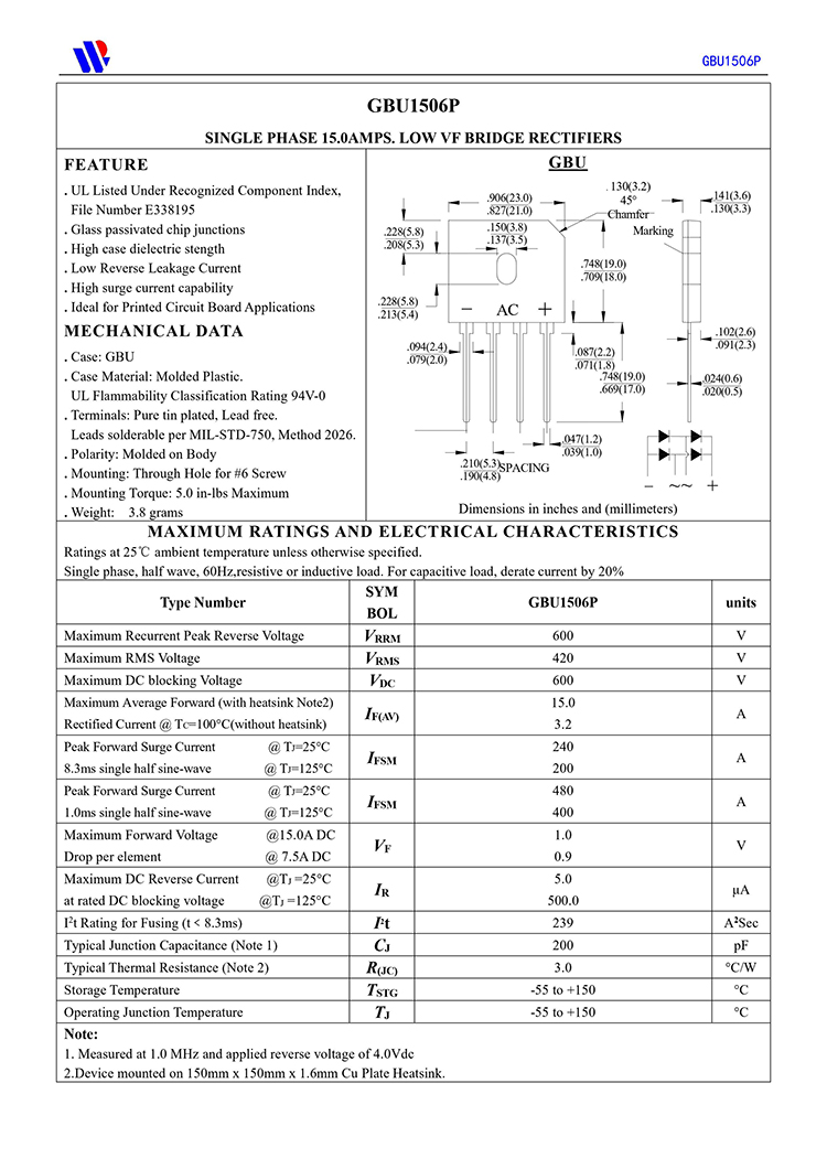 PY/平伟 原厂原装全新正品高频快恢复整流桥:GBU1506P;反向恢复时间:250ns;最大正向平均整流电流IF:15A;最大正向峰值抗浪涌电流IFSM:200A;最大反向峰值电压VRRM:600V;正向压降VF:1.05V;反向漏电流IR:5ua;芯片工作储存结温:-55℃~150℃;安装封装方式:GBU-4 : 22.3*3.6*18.8mm。