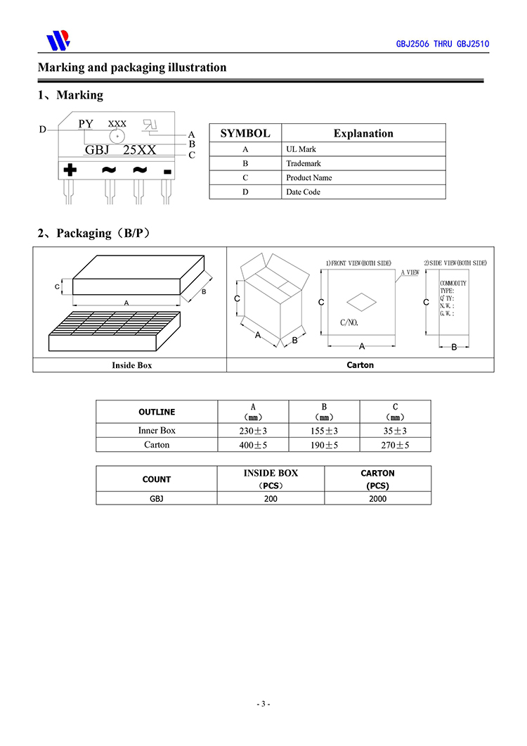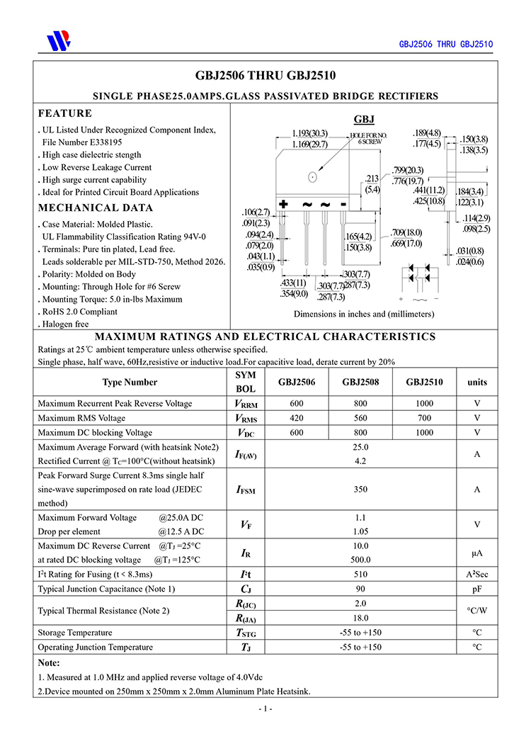 本品采用内置GPP玻璃钝化工艺大尺寸芯片,具有适应高电压大电流大功率等电气特性特点,插件针脚式引脚安装简单方便,环氧树脂封胶导热效率高自散热好,单排薄扁体积大功率整流桥堆GBJ2512,GBJ2510,GBJ2508,GBJ2506,GBJ2504。