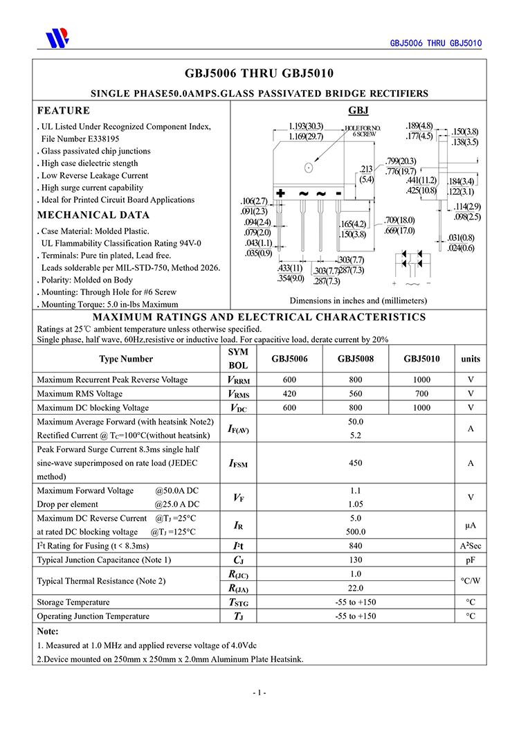 本品采用内置GPP玻璃钝化工艺大尺寸芯片,具有适应高电压大电流大功率等电气特性特点,插件针脚式引脚安装简单方便,环氧树脂封胶导热效率高自散热好,单排薄扁体积大功率整流桥堆GBJ5012,GBJ5010,GBJ5008,GBJ5006,GBJ5004。