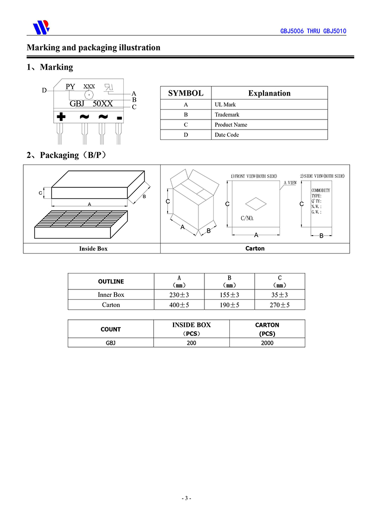【页面标价非成交价,请联系详询报价】 PY/平伟 原厂原装全新正品整流桥:GBJ5012、GBJ5010、GBJ5008、GBJ5006、GBJ5004;最大正向平均整流电流IF:50A;最大正向峰值抗浪涌电流IFSM:450A;最大反向峰值电压VRRM:1200V~400V;正向压降VF:1.05V;反向漏电流IR:5ua;芯片工作储存结温:-55℃~150℃;安装封装方式:GBJ-4大体积 : 30.3*4.8*20.3mm。