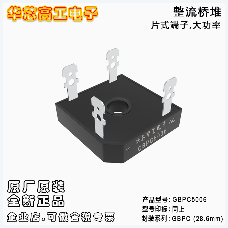 【页面标价非成交价,请联系详询报价】 JF/晶恒 原厂原装全新正品整流桥:GBPC5012、GBPC5010、GBPC5008、GBPC5006、GBPC5004;最大正向平均整流电流IF:50A;最大正向峰值抗浪涌电流IFSM:450A;最大反向峰值电压VRRM:1200V~400V;正向压降VF:1.05V;反向漏电流IR:5ua;芯片工作储存结温:-55℃~150℃;封装安装方式:GBPC端子 : 28.8*28.8*8.1mm。
